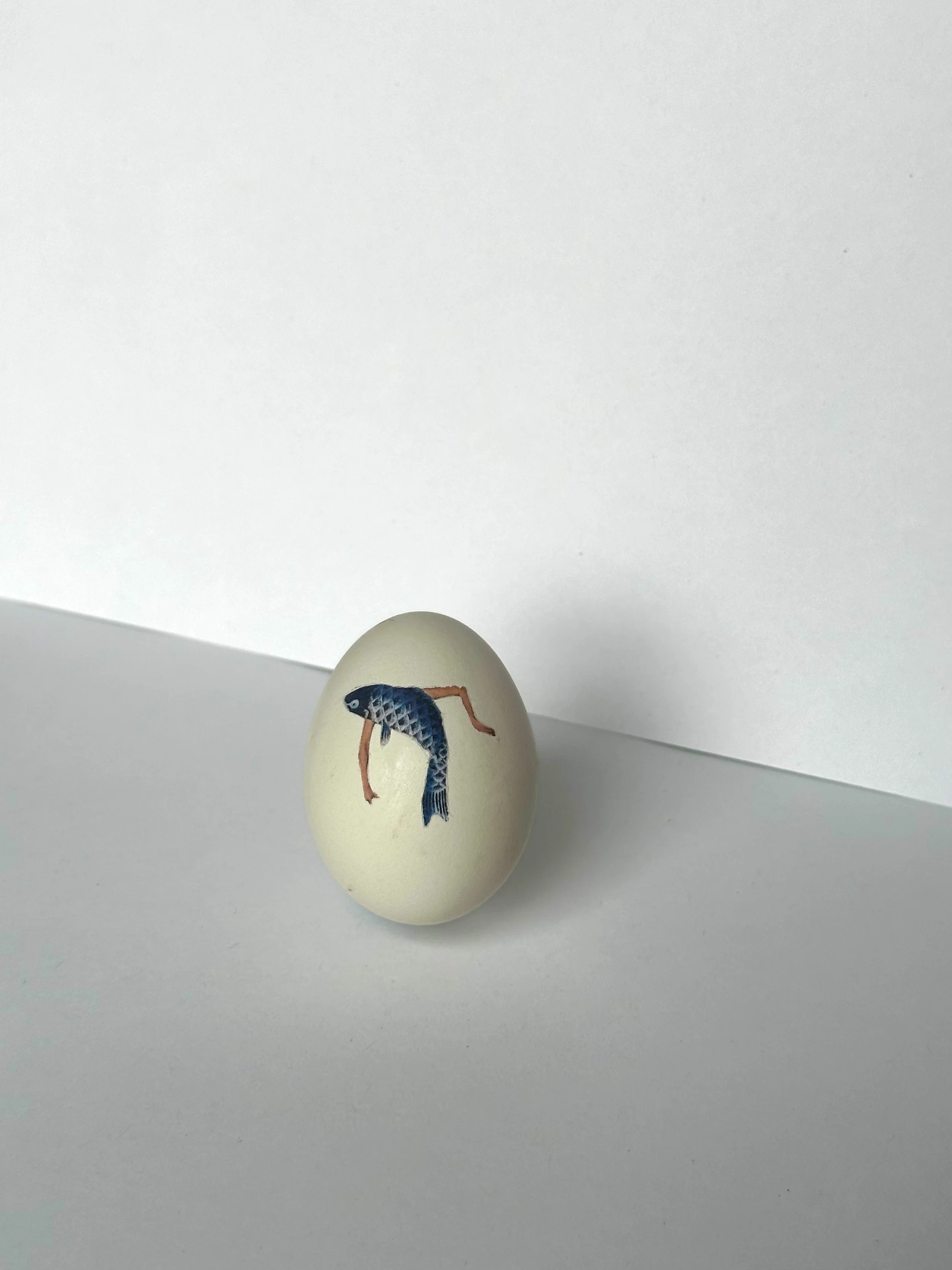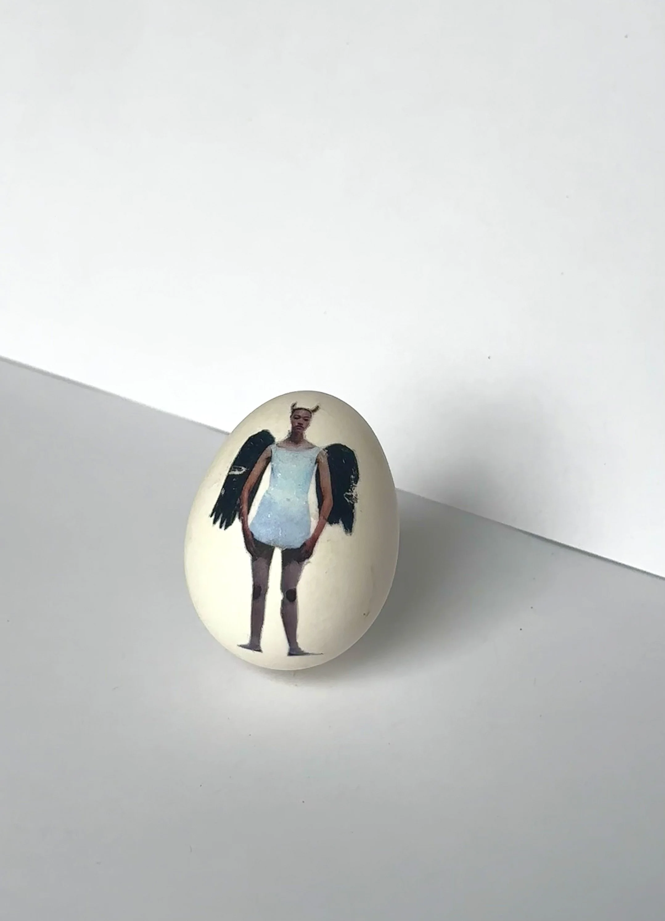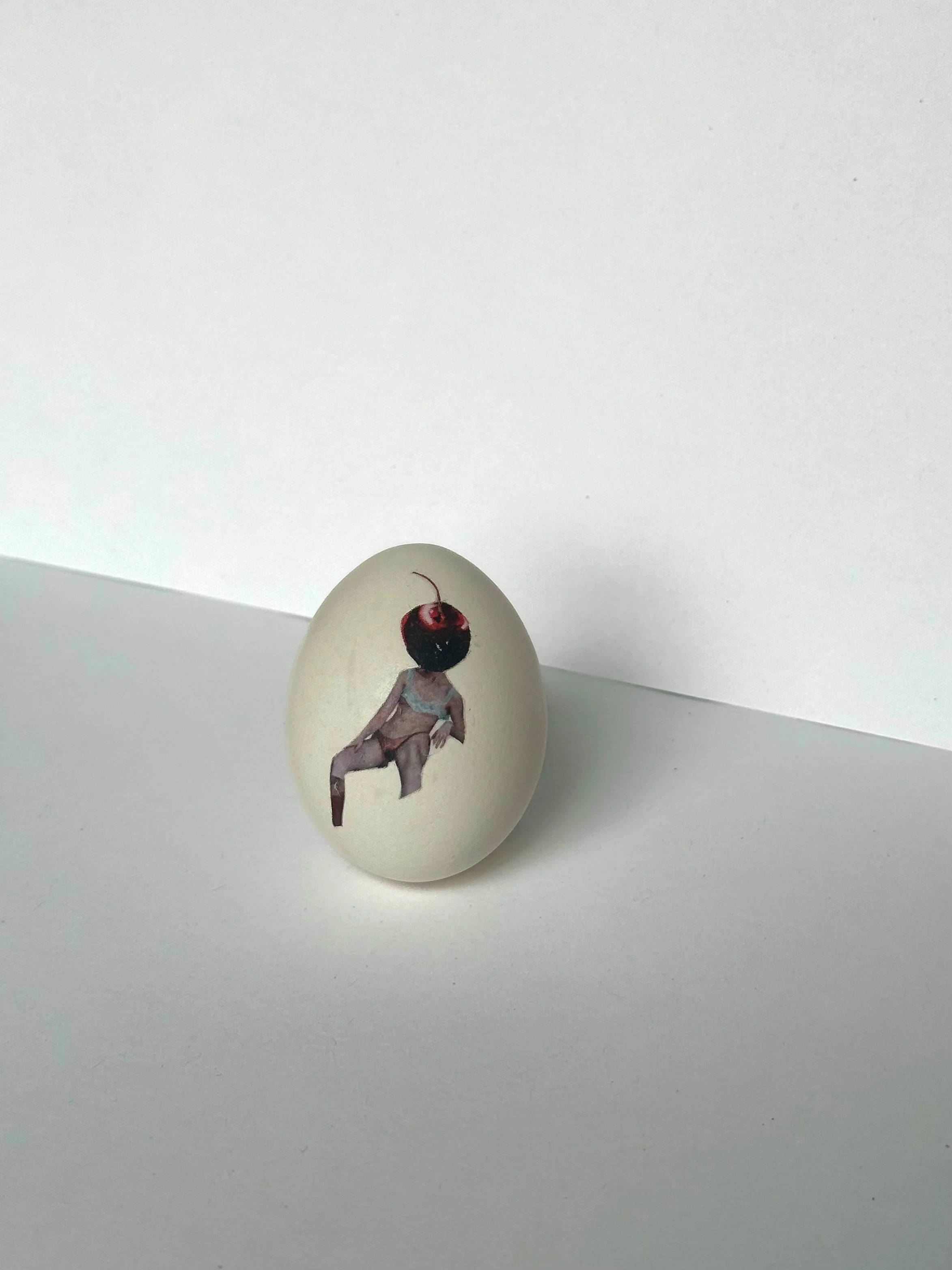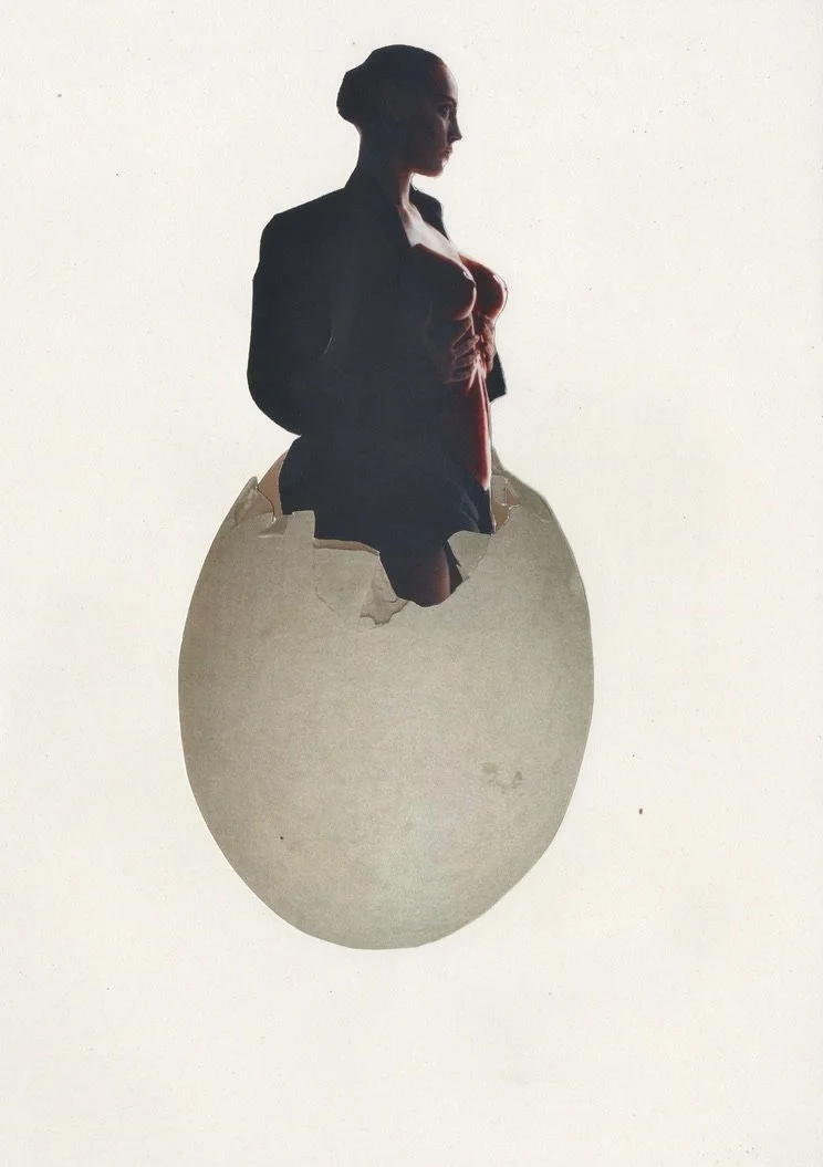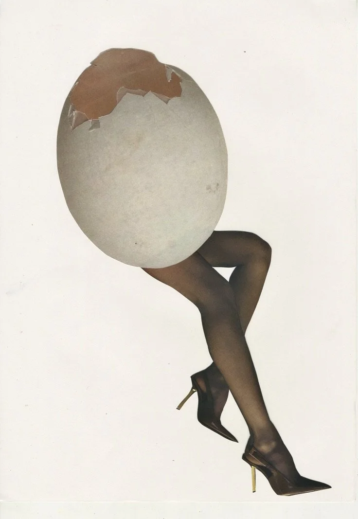 Hatched explores the symbolic weight of the egg in fifteenth and sixteenth century art, where it often represented creation, purity, and the fragile boundary between the sacred and the profane. Drawing on this duality, each piece begins with a hollowed eggshell, a delicate form, blown out by hand, onto which my collages are image-transferred. The imagery is inspired by the hybrid creatures found within religious paintings of the fifteenth and sixteenth century , where divine and earthly forms merge in strange harmony. Within these fragile shells, life and corruption coexist; beauty is born, already trembling on the edge of decay.